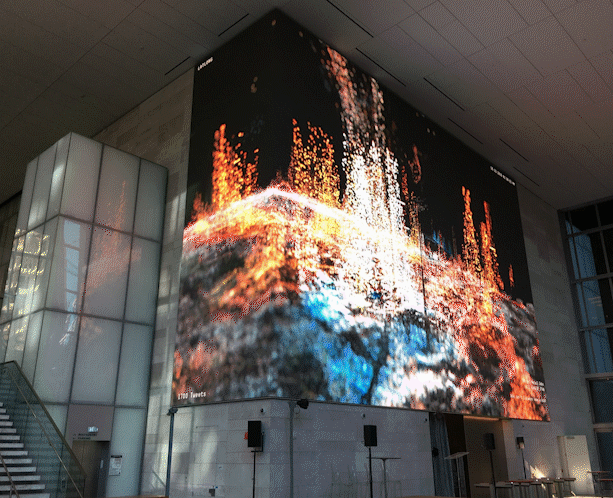 一塊長(zhǎng)達(dá)108英尺、超過(guò)700萬(wàn)像素的LED高清顯示屏廣告墻,將“瀑布”搬進(jìn)了Salesforce的寫字樓里,讓整個(gè)空間頓生活力。