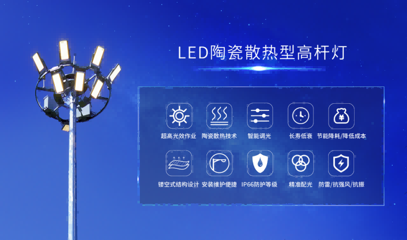 安裝于重點運動會體育場館外及生活廣場的LED高桿燈是一種實用性強、性價比高的照明產品。不僅照明功能強大,作為燈飾也能美化環境,讓夜間出行有生活保障。
