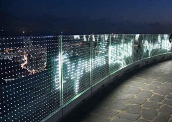 LED光電玻璃屏主要由內層導電玻璃、LED芯片光源、外層玻璃三部分組成。除有LED燈珠外,無任何其他元器件,電路板完全透明,既保持了玻璃超高透特性,又能通過光電軟件控制來呈現顯示效果,從而實現圖文顯示及視頻播放。
